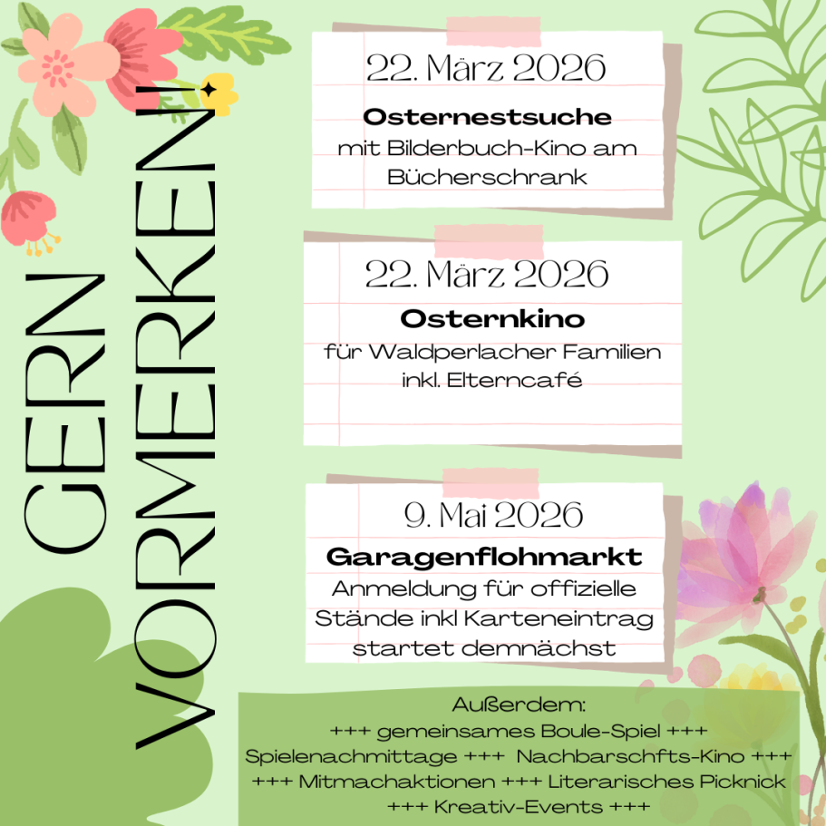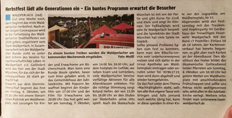 Unser Waldperlach ist ein gemeinnütziger Verein, der Nachbarschaft erlebbar macht. Wir organisieren Feste, Kulturveranstaltungen, Mitmachaktionen und Treffpunkte für Jung und Alt. Ob Kinderfasching, Stadtteilkino oder Adventskalender – wir bringen Menschen zusammen und fördern das Miteinander im Viertel.